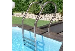De ombouw van deze Gré Normandië heeft een dikte van 46mm, de afdekkappen zijn 28mm. Deze worden aan elkaar vastgemaakt door middel van RVS strips. De combinatie van deze RVS strips en het grenen hout zorgt ervoor dat je zwembad een hele luxe, natuurlijke en ook een robuuste look krijgt.