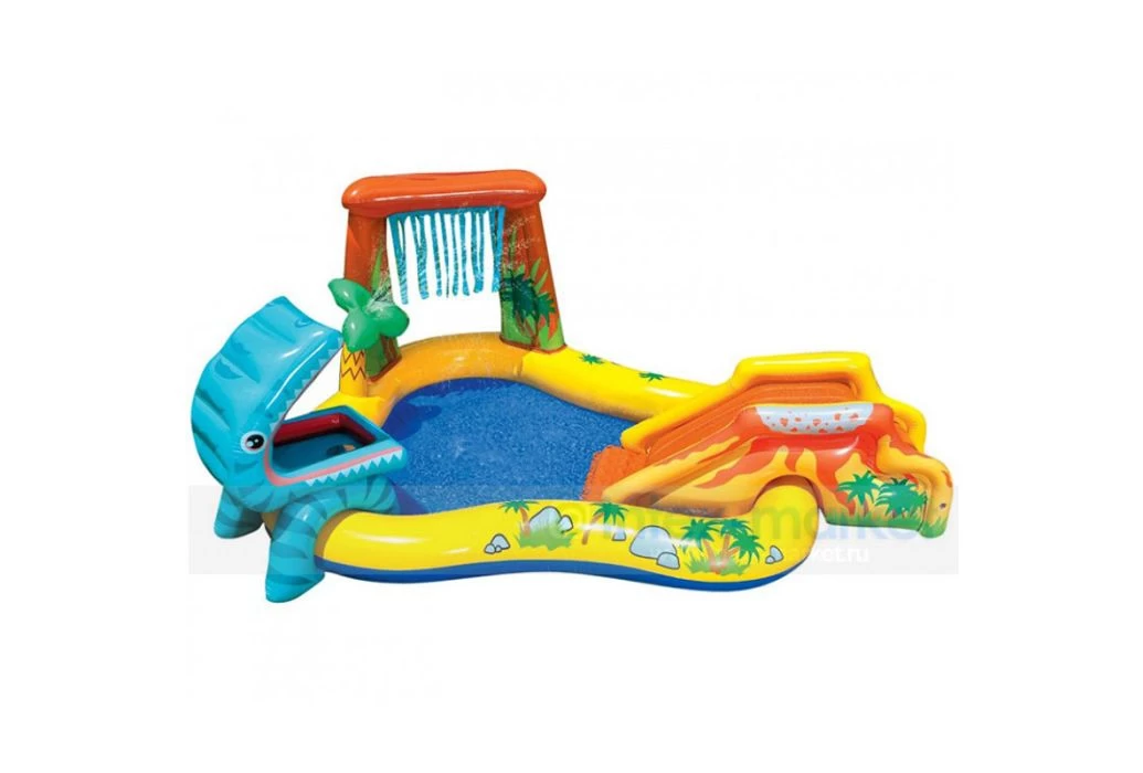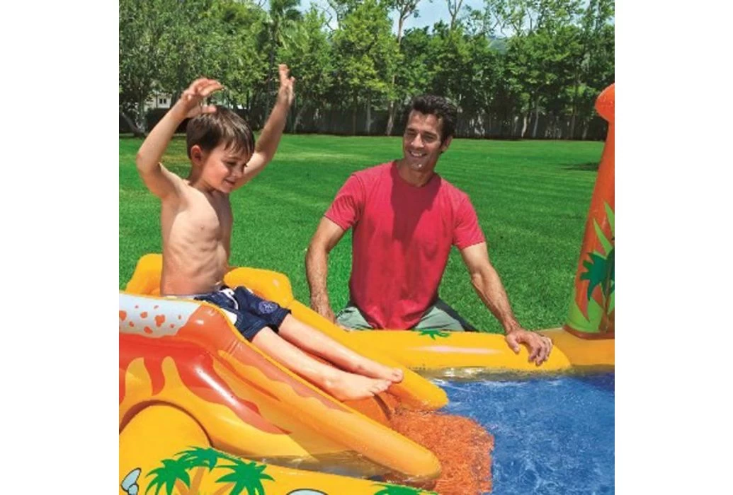 Het dinosaurus speelcentrum bestaat uit een dinosaurus, een palmboom waterval en een glijbaan. Het zwembad is eenvoudig op te zetten en is aan te sluiten op een tuinslang.