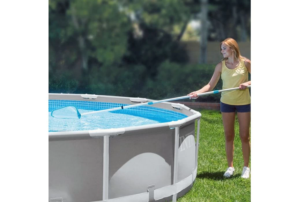 Met deze Intex onderhoudsset is je zwembad eenvoudig schoon te maken. De onderhoudsset bevat een stofzuiger welke aan te sluiten is op een tuinslang. Hiermee kan vuil van de bodem van je zwembad eenvoudig verwijderd worden. Daarnaast kan het meegeleverde oppervlakte schepnet gebruikt worden voor vuil en bladeren welke op het water drijven. Beide componenten zijn aan te sluiten op de meegeleverde telescopische steel om het bereik te vergroten.