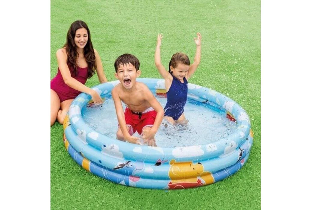 Urenlang speelplezier met dit leuke Winnie the Pooh zwembadje van Intex! Dit zwembad heeft een leuke print met alle figuren uit Winnie the Pooh, zo beleef je alle avonturen zelf. Het badje staat binnen enkele minuten door de opblaasbare rand.