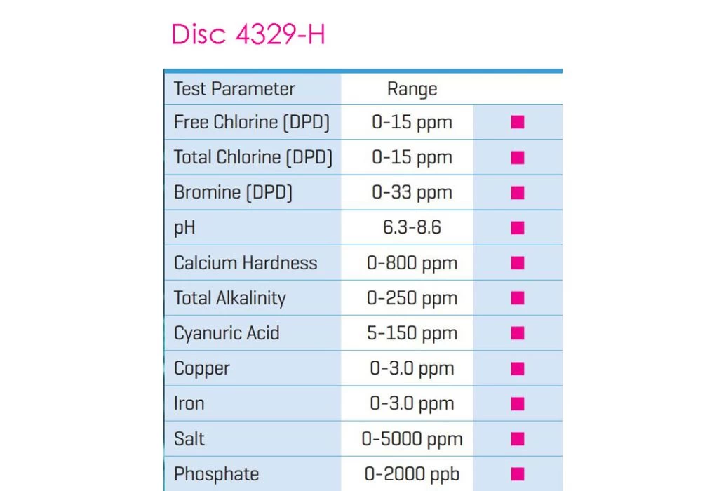 | testresultaat | Alkaliteit, Bromine, Calcium, Chloor (totaal), Chloor (vrij), Cyanuurzuur, Hardheid, Koper, pH, Zout |