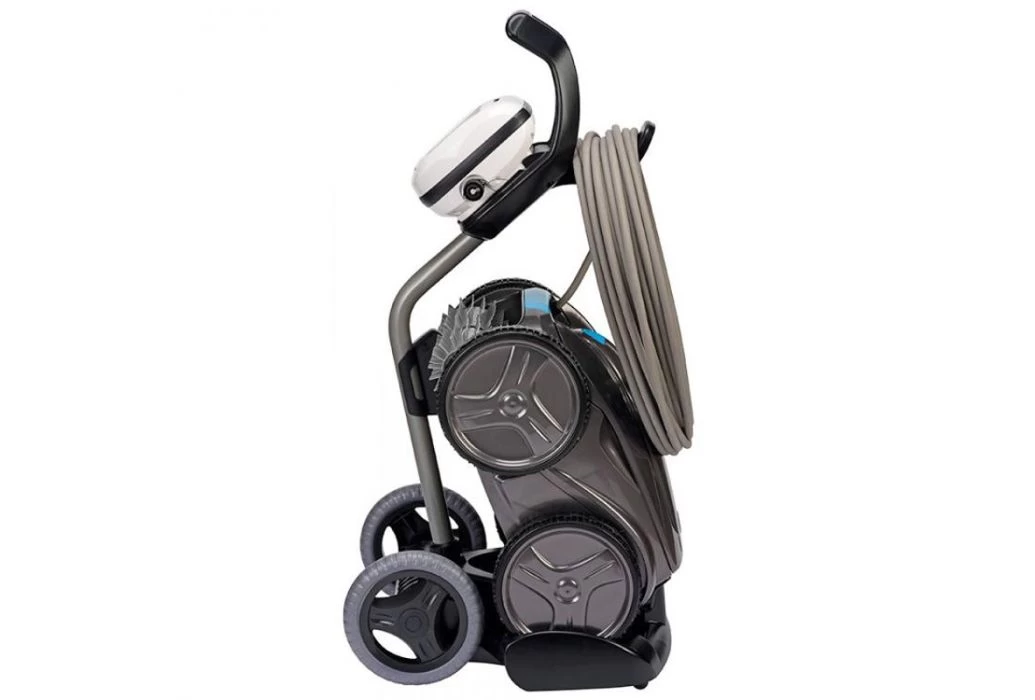 Wanneer je zwembadrobot klaar is met een reinigingsprogramma kun je de robot eenvoudig in deze caddy zetten. Daarna kun je, dankzij de wielen, de robot gemakkelijk wegrollen en opbergen.